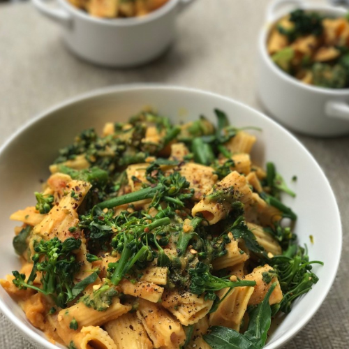 - In the large bowl holding the pasta, toss pasta with chopped broccolini and sauce until evenly coated. You may have some extra sauce, which you can freeze for later. Salt to taste.