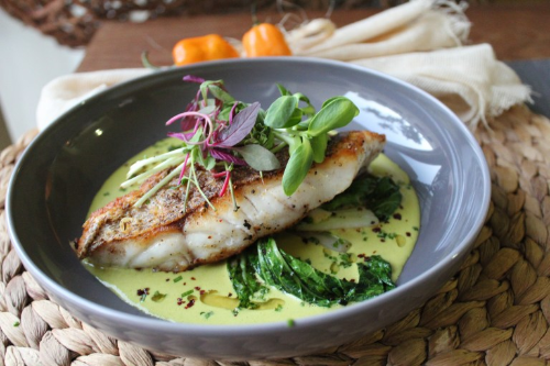 - Pour coconut broth into shallow bowls. Place fish fillet skin side up in each bowl and top with microgreens and sprouts. Top with sea salt and olive oil and serve.